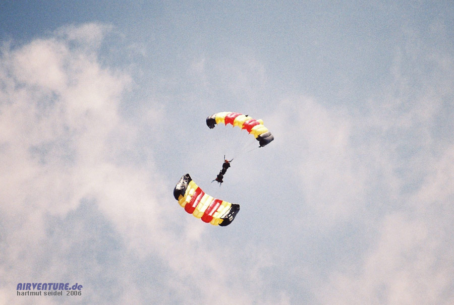 Position an den geöffneten Fallschirmen in der Luft etliche Male regelrechte Saltos