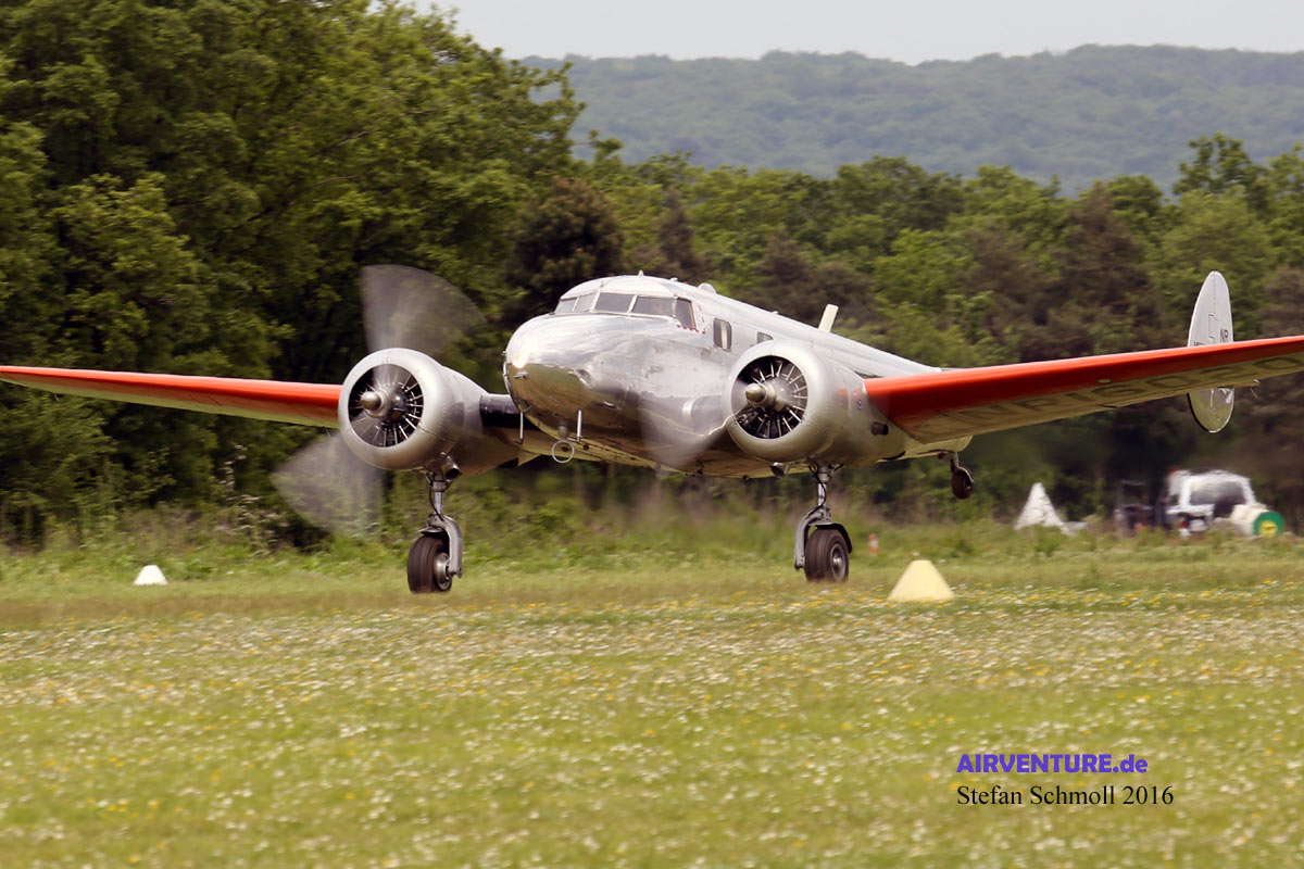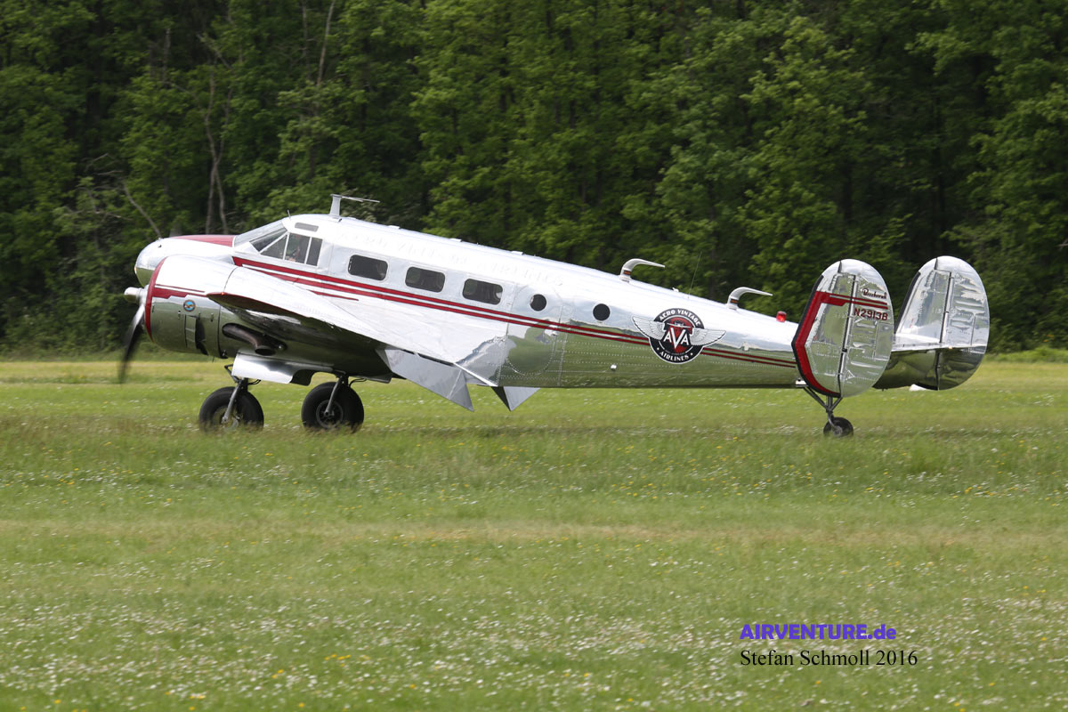 Mehr als drei Jahrzehnte - von 1937 bis 1970 - war die Beech 18 in Produktion. Rund 9000 Exemplare verließen die Bänder und entsprechend viele Exemplare finden sich heute noch auf allen Kontinenten. Diese Beech wurde wenige Tage vor der Veranstaltung von Salis aus den Vereinigten Staaten im Flug überführt und ist ab sofort in La Ferté Alais stationiert. |