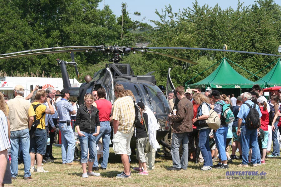 Die deutsche Bundeswehr hat beim FFH-Flugtag 2009 auf dem Flugplatz von Langenselbold diesen Hubschrauber vom Typ MBB Bo 105 im Zuschauerbereich ausgestellt, wo er den ganzen Tag über - und auch noch nach Einbruch der Dunkelheit während des Nachtprogramms - ununterbrochen von interessierten Besuchern umringt und bestaunt worden ist. |