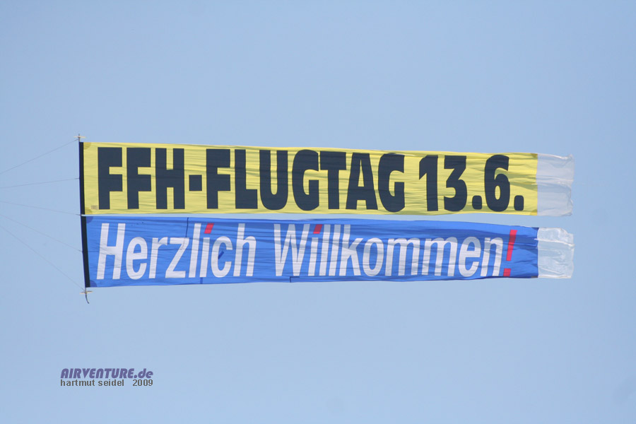 Schon seit einiger Zeit vor dem FFH-Flugtag 2009 in Langenselbold war ein Flugzeug mit einem Schleppbanner über Hessen unterwegs, mit welchem auf die Veranstaltung am 13. Juni hingewiesen worden ist. Die Maschine war auch während des Flugtags in der Luft und hat hierbei auch das Veranstaltungsgelände überflogen. |