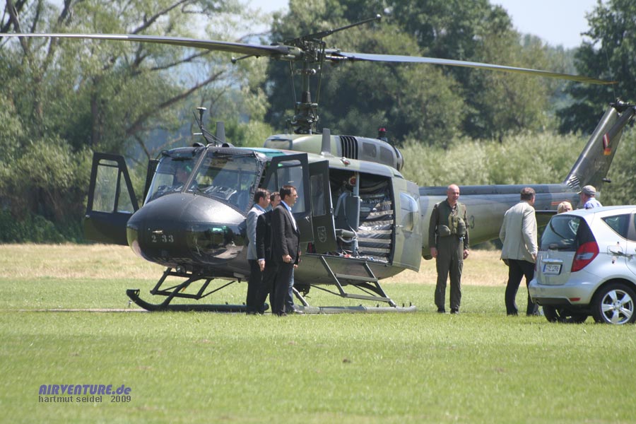 Bundesverteidigungsminister Dr. Franz Josef Jung ( dritter von rechts ) ist mit diesem Bundeswehrhubschrauber vom Typ Bell UH-1D auf dem Flugplatz Langenselbold eingetroffen, um den FFH-Flugtag 2009 feierlich zu eröffnen. |