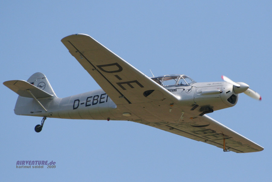 Neben den interessanten historischen amerikanischen Flugzeugtypen, wie den zwei Boeing Stearman Doppeldeckern und den in Teil 1 dieses Berichts bereits gezeigten beiden North American T-6 von Walter und Toni Eichhorn, war beim FFH-Flugtag 2009 mit dieser silbernen Messerschmitt Bf 108 Taifun der Deutschen Lufthansa Berlin-Stiftung auch noch ein sehr schönes Oldtimerflugzeug aus Deutschland zu sehen. |