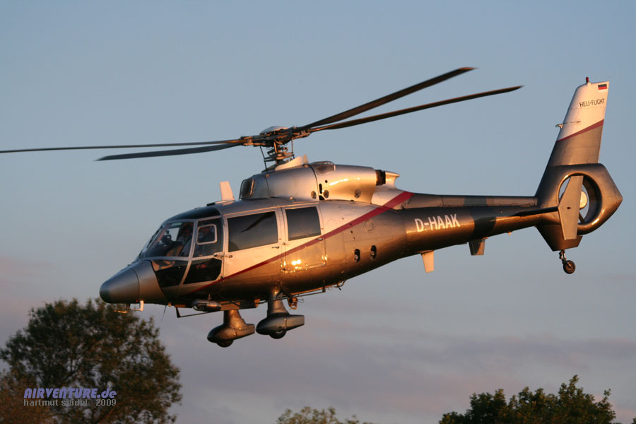Dieser Hubschrauber vom Typ Aérospatiale SA 365 Dauphin der in Reichelsheim beheimateten Firma Heli-Flight wurde im Rahmen des FFH-Flugtag 2009 in Langenselbold für eine Vielzahl von unterschiedlichen Transportaufgaben verwendet. |