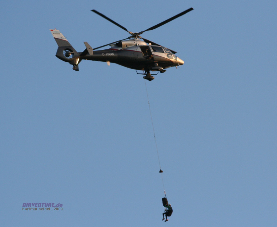 Zu den Aufgaben des Dauphin-Hubschraubers während des FFH-Flugtag 2009 gehörte es auch, den österreichischen Extrem-Gleitschirmflieger "Mad Mike Küng" an einem Aussenlastseil unter dem Hubschrauber hängend für den Beginn seiner Vorführung auf Ausgangshöhe zu bringen. |