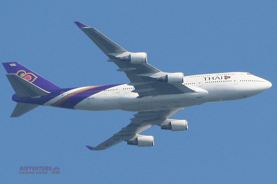 Der Flugplatz von Langenselbold liegt in der Einflugschneise des etwa 40 Kilometer in südwestlicher Richtung befindlichen stark frequentierten Verkehrsflughafens Frankfurt am Main, der von vielen Großraummaschinen aus aller Welt angeflogen wird. Deswegen konnte man während des FFH-Flugtag 2009 zusätzlich zu dem actionreichen Flugprogramm die ganze Zeit über auch noch viele interessante Verkehrsflugzeuge, wie zum Beispiel diesen Boeing 747-400 Jumbo-Jet der Fluggesellschaft Thai Airways..... |