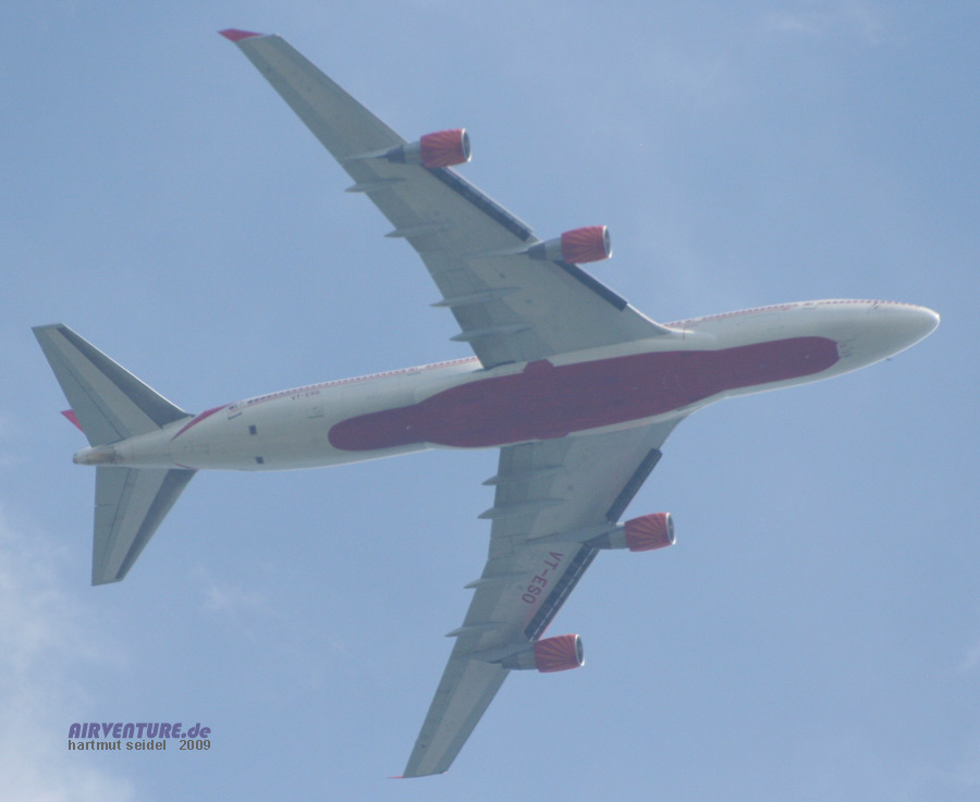 .....und diesen Boeing 747-400 Jumbo-Jet der Air India im Landeanflug auf den Frankfurter Flughafen bewundern. Schwierigkeiten für die Durchführung des Flugtages ergaben sich durch die Verkehrsflugzeuge nicht : Die Flugzeuge im Anflug auf den Frankfurter Flughafen befanden sich alle in einer Höhe von deutlich über 1.000 Meter über dem Grund, so daß der Luftraum bis etwa 1.000 Meter Höhe problemlos für die Flugvorführungen genutzt werden konnte. Ausserdem hielt das Airshowteam vor Ort natürlich auch ständigen Kontakt mit der Deutschen Flugsicherung. Die beiden Jumbo-Jet Fotos hier wurden übrigens mit starkem Teleobjektiv aufgenommen, die tatsächliche Entfernung der Maschinen ist also deutlich größer als es den Anschein hat. |