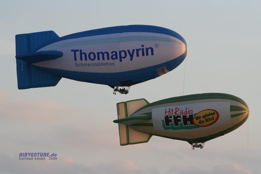 Bei wunderschöner Abendstimmung und hervorragenden Wetterbedingungen waren im Spätprogramm des FFH-Flugtag 2009 auch zwei Heißluft-Luftschiffe über dem Flugplatz von Langenselbold zu sehen. |