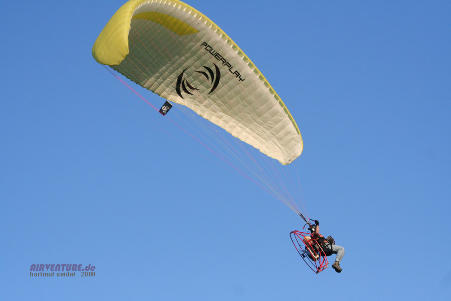 Am frühen Abend des 13. Juni, in der Zeit zwischen dem Hauptflugprogramm und dem mit dem Anbrechen der Dunkelheit beginnenden Nachtprogramm des FFH-Flugtag 2009, wurden noch einige gemütliche und schön anzusehende Vorführungen mit leichtem Fluggerät gezeigt. Hierzu gehörte auch eine Parade von Motorgleitschirmfliegern. |