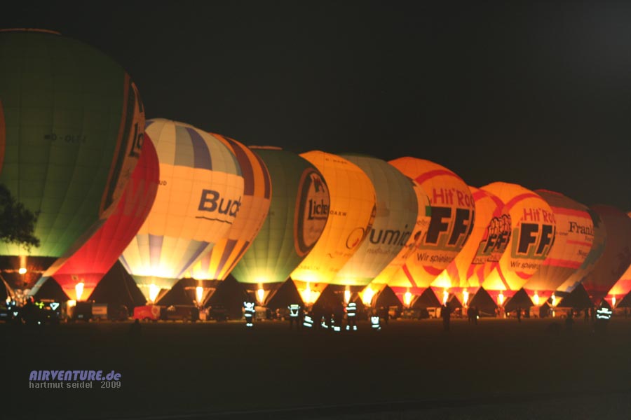 Während am Nachthimmel das Feuerwerk zu bewundern war, wurde gleichzeitig auf dem Boden mit etlichen Heißluftballons ein "Night Glow" gezeigt. Bei diesem nächtlichen "Ballonglühen" werden die Ballonhüllen durch regelmäßiges Betätigen der Heißluft-Brenner immer wieder von innen zum Leuchten gebracht, ohne das die Ballons dabei abheben. |