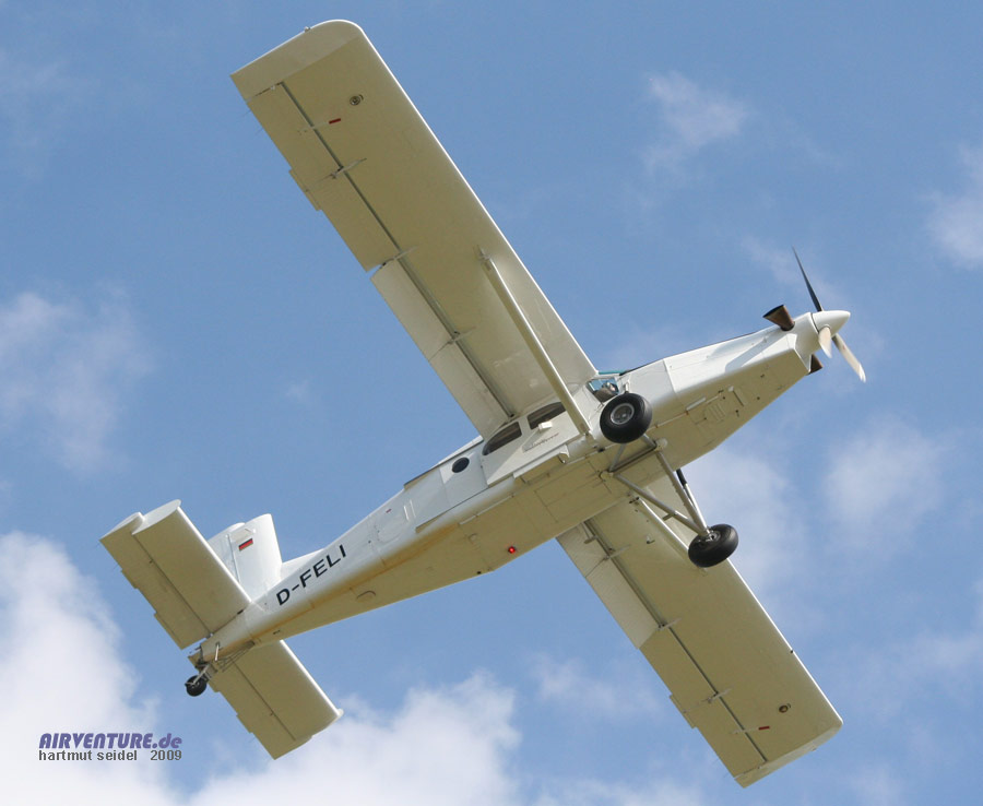 Im Flugprogramm des FFH-Flugtag 2009 waren auch zivile Fallschirmspringer zu sehen, die aus dieser Maschine vom schweizerischen Typ Pilatus PC-6 Turbo Porter abgesprungen sind. |