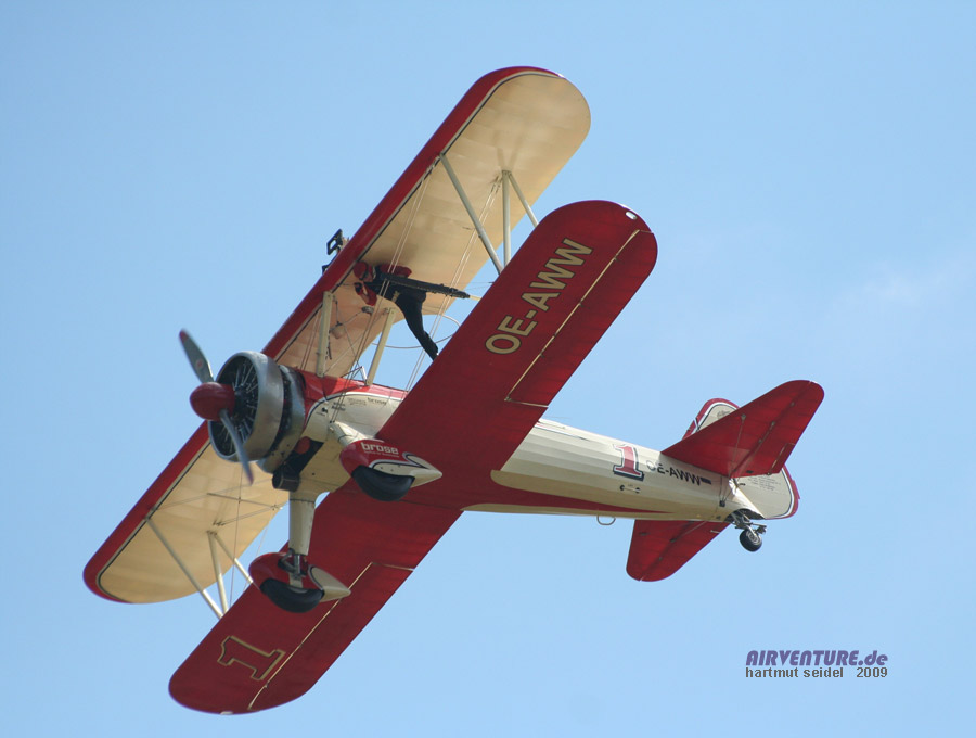 Die Wing-Walkerin Peggy Krainz zeigte während des FFH-Flugtag 2009 spektakuläre Stunts auf- und auch zwischen den Tragflächen dieses von Friedrich Walentin gesteuerten Boeing Stearman PT-17 Doppeldeckers. |