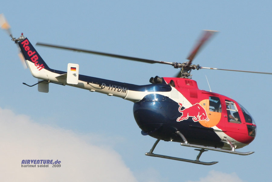 Rainer Wilke zeigte während des FFH-Flugtag 2009 eine sehr eindrucksvolle Kunstflugvorführung mit diesem Hubschrauber vom Typ Messerschmitt-Bölkow-Blohm Bo 105 aus der berühmten "Flying Bulls"-Flotte der österreichischen Firma Red Bull. |