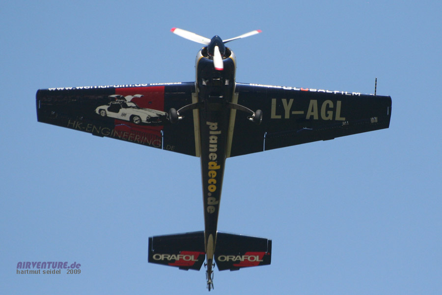 Im Flugprogramm des FFH-Flugtag 2009 auf dem Flugplatz von Langenselbold gab es neben den in Teil 1 dieses Berichts bereits gezeigten Flugvorführungen in Formation auch noch etliche Solo-Displays zu sehen. Hierzu gehörte auch eine sehr eindrucksvolle Hochleistungs-Kunstflugdarbietung von Uli Dembinski mit seiner Maschine vom russischen Typ Yakovlev Yak-55. |