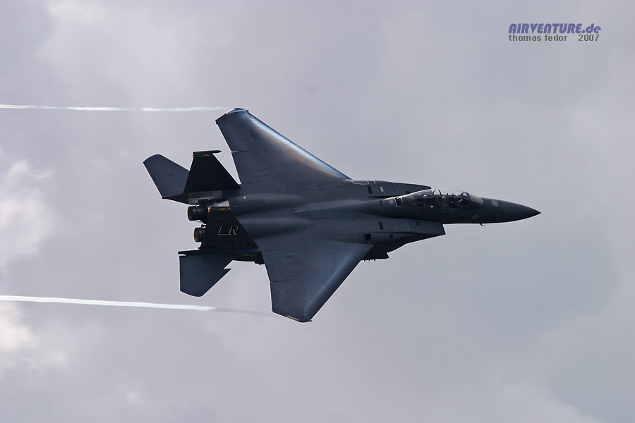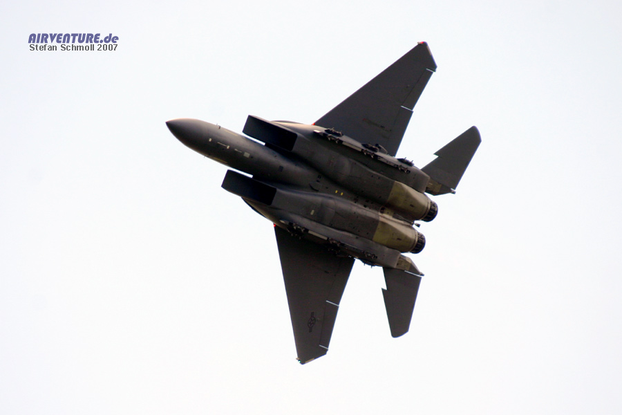 Was für ein Beginn von Flying Legends. Als Opener der Show gab die F-15 Strike Eagle der USAF ein Solodisplay mit taktischen Manövern. |