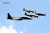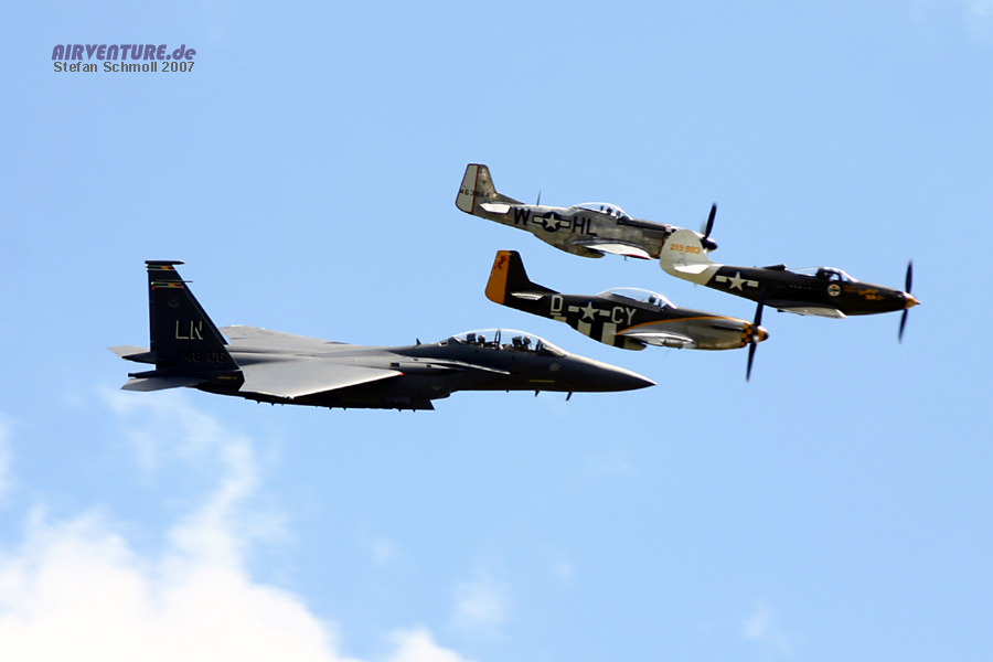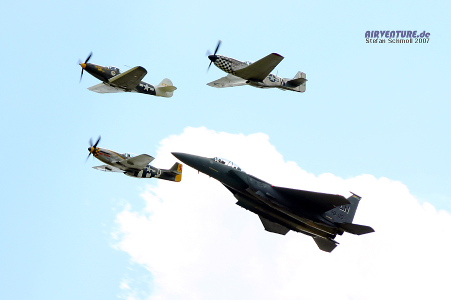 Und natürlich war die Solovorführung nicht der einzige Grund, die F-15 einzuladen. Erstmals gab es über Duxford den in den Vereinigten Staaten beliebten `Heritage Flight´. Hier sind moderne und historische Kampfflugzeuge der USAF gemeinsam im engen Verbandsflug zu sehen. |