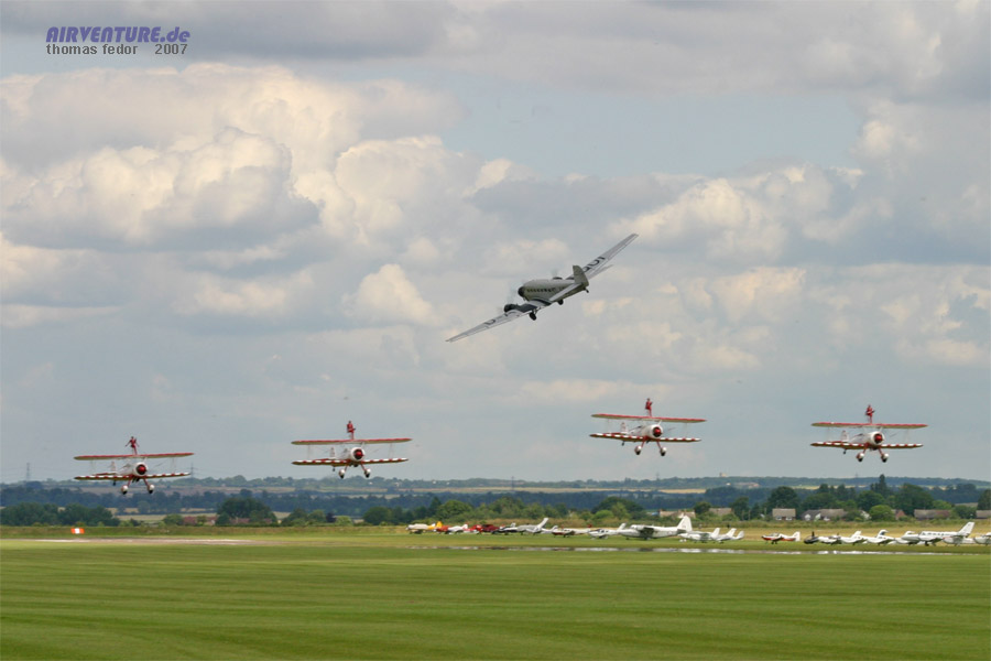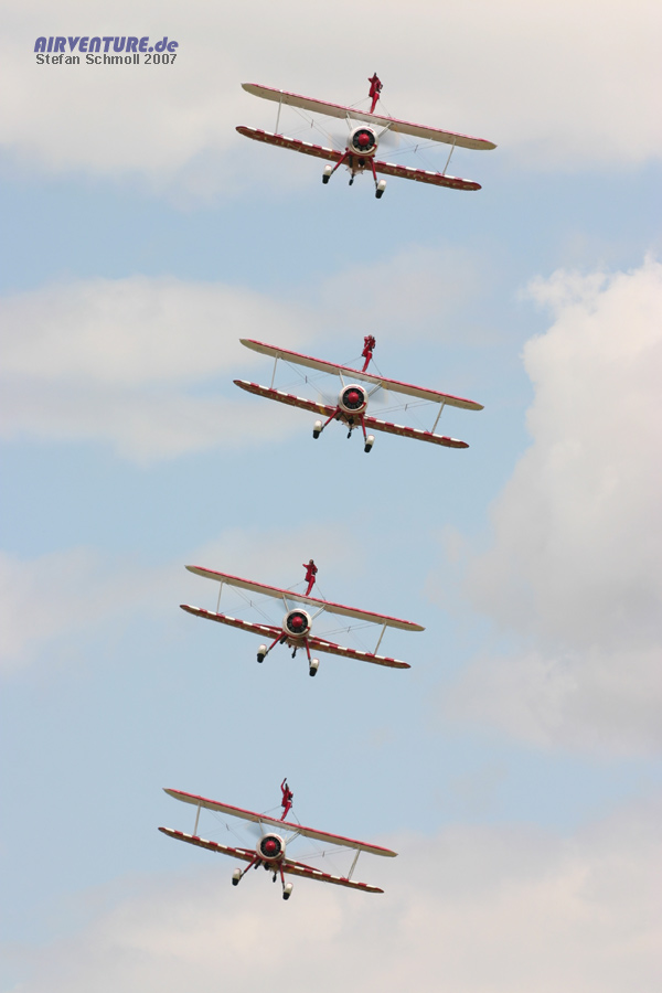 Noch ist die Junkers der Lufthansa in der Luft, und schon starten die vier Boeing Stearman des Wingwalking Teams `Guinot´ zu ihrer beeindruckenden Vorführung. Der Sponsor ist neu - das Team allerdings nicht. In den vergangenen Jahren firmierten die Flieger unter `Utterly Butterly´ und waren gelb-blau lackiert. |