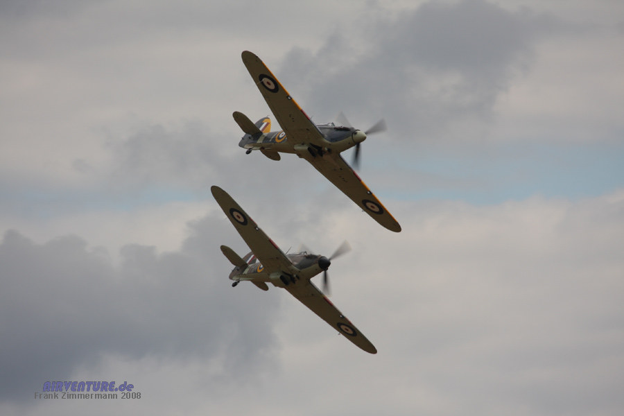 Im Formationsflug am Himmel über Duxford: die Hawker Hurricanes der Shuttleworth und der Historic Aircraft Collection.