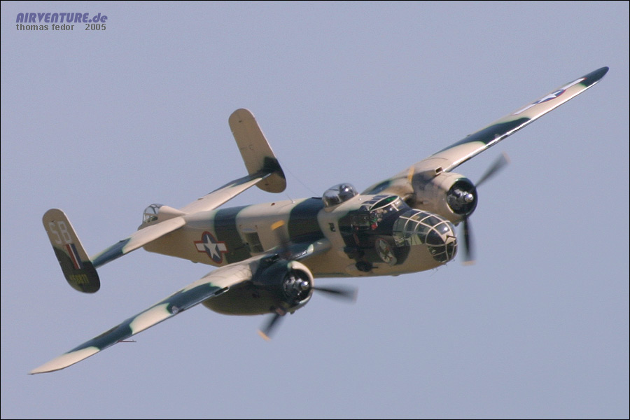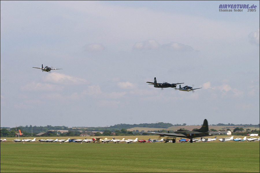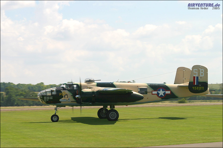 Wie es in Duxford keine Seltenheit ist, wurde in Formation gestartet. Hier sieht man beide B-25 und die Pink Lady beim Start. Rechts fliegt die B-25J-20 der Duke of Brabant Air Force. Mit 6200 Flugstunden kam sie 1959 für 1400 Dollar in zivile Hände. Mit einem großen Wassertank in ihrem Rumpf, transportierte sie lange Zeit tropische Fische von Peru nach Ohio.