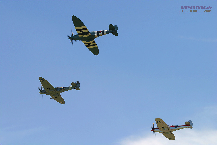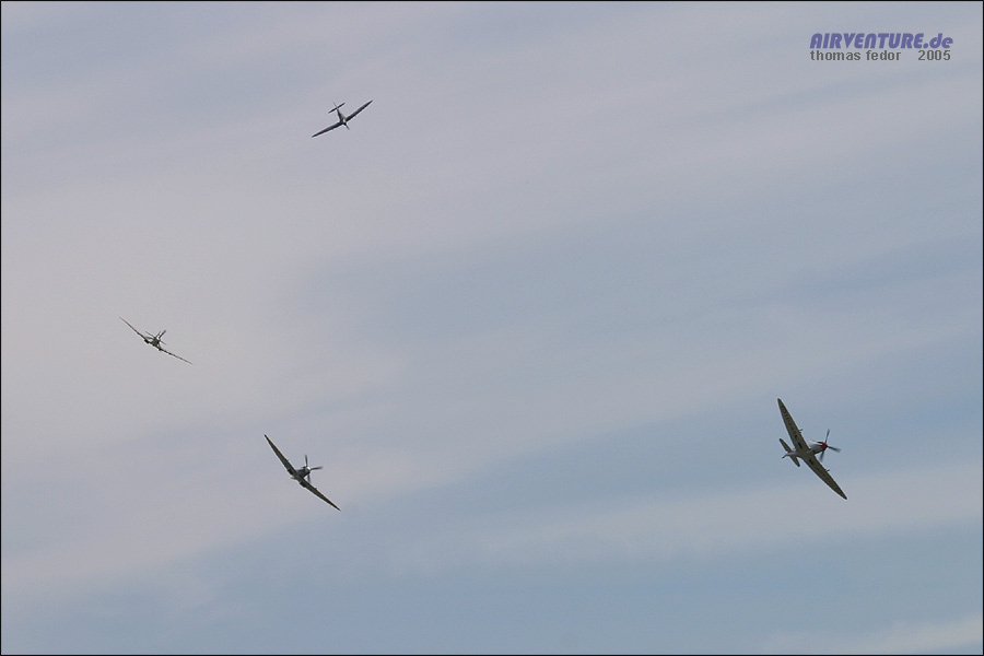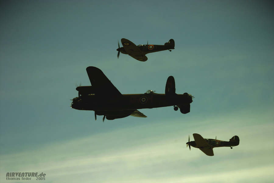 Formationsflug der Lancaster, Spitfire und Hurricane der Battle of Britain Memorial Fighter. In dieser Formation ging es am Sonntag nach London. Hier ist gerade der Bombenschacht der Lancaster geöffnet.