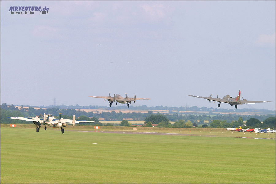 In Deutschland undenkbar. Die startende B-17 "Sally B." wird von der "Tigerformation" in niedriger Höhe überflogen. |