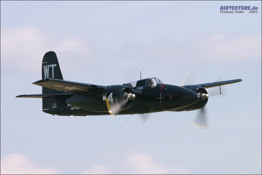 Die F7F-3P der Fighter Collection. Insgesamt wurden 360 Stück für das US Marine Corps gebaut. Mit 2 Pratt & Withney Double Wasp R-2800 (Luftgekühlter 18 Zylinder-Sternmotor) erreicht sie sagenhafte 740 km/h (460 mph). |