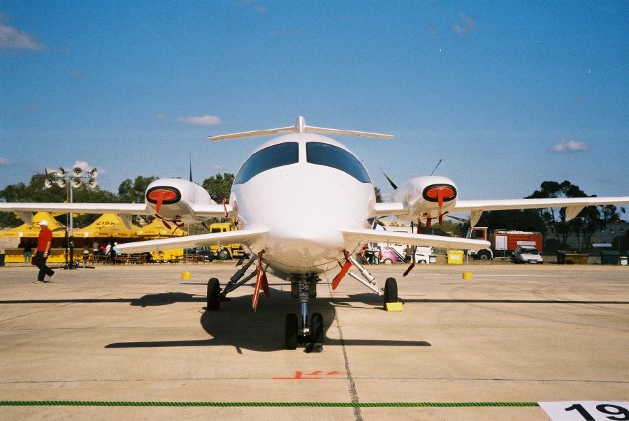 die beiden "Pusher"-Triebwerke mit Druckpropeller sowie der sehr