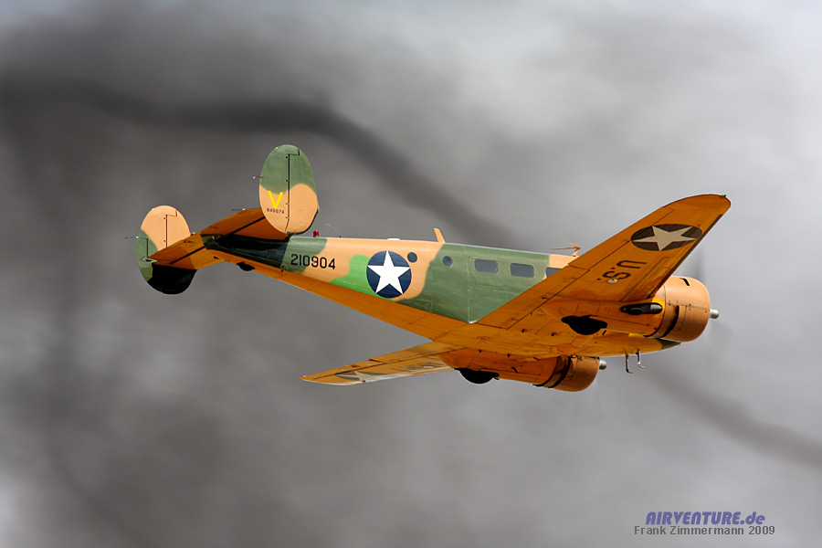 Eine Beech C-45 Expeditor im Camouflage-Anstrich. Im Hintergrund sieht man noch den schwarzen Rauch der Pyrotechnik, die im Rahmen der Show gezündet wurde .