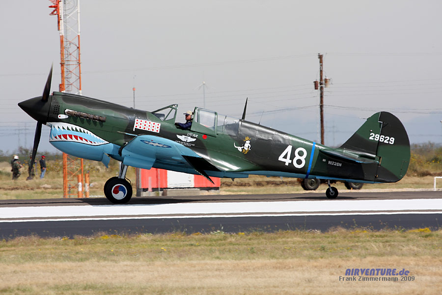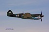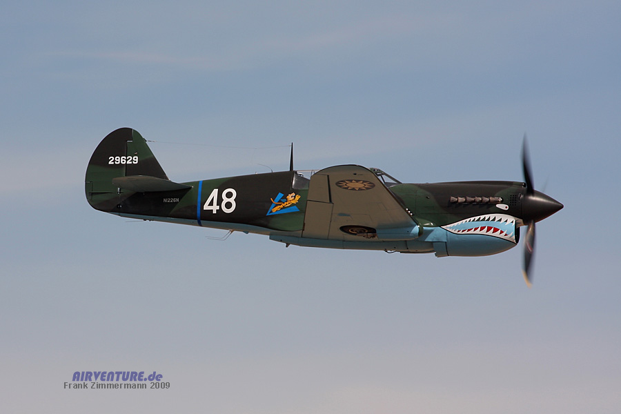 Warhawk im Überflug. Diese Curtiss P-40 ist lackiert in den Farben der "Flying Tigers". Markenzeichen der AVG (American Volunteer Group) war das Haifischmaul.