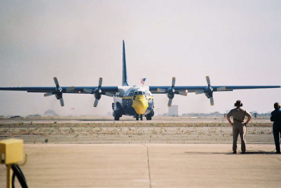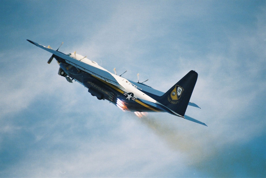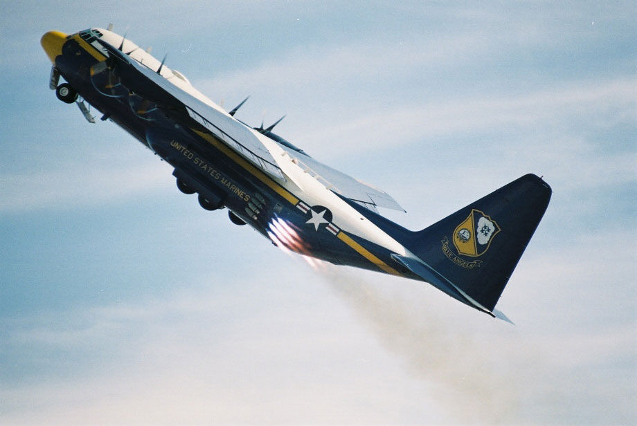 Hercules im farbenprächtigen Blue Angels-Anstrich einen außerordentlich faszinierenden