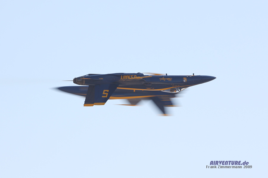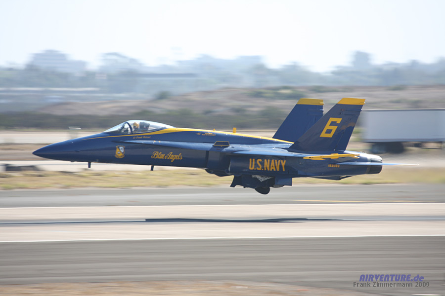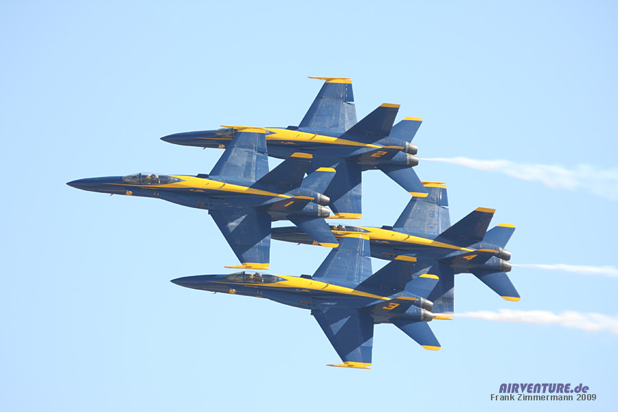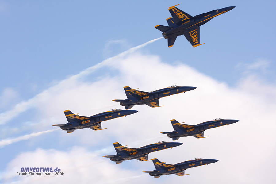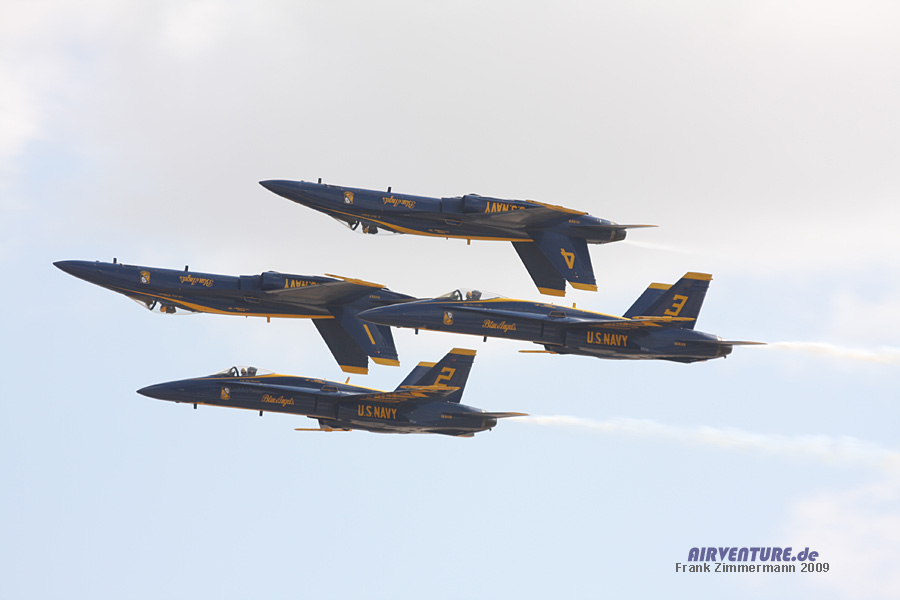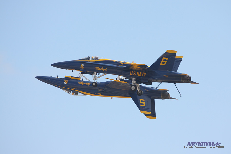Der Höhepunkt für viele Besucher war der Auftritt der Blue Angels mit ihren F/A-18 Hornets. Über eine halbe Stunde zeigte das Kunstflugteam der US Navy eine atemberaubende Show. Das Programm umfasste Formationsflüge mit allen Maschinen zusammen, Solodisplays und spannende Begegnungsmanöver. Leader der Blue Angels war Cdr. Greg McWherter. |