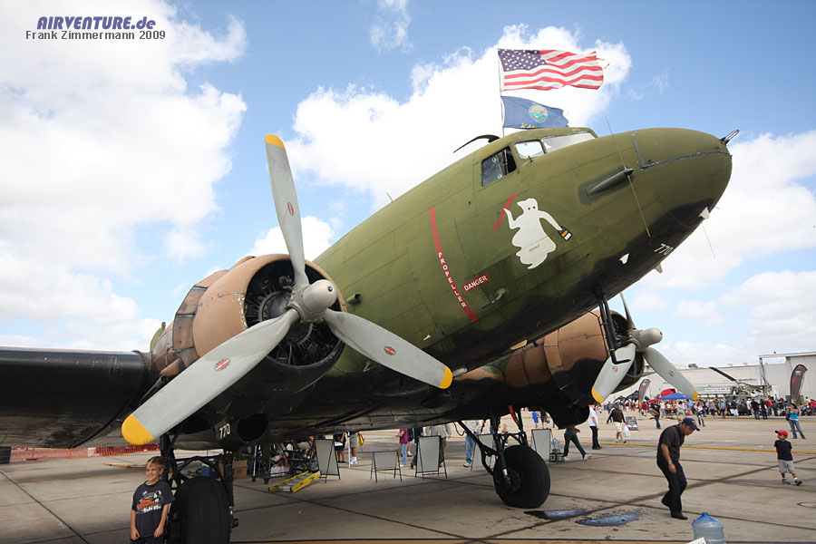Mal nicht als Transporter oder Absetzflugzeug für Fallschirmjäger war diese Variante der berühmten DC-3 oder C-47 eingesetzt. Es ist eine AC-47 Spooky, die für den Bodenangriff bzw. Luftunterstützung auf ihrer linken Rumpfseite 3 Gau-2A/M134 Miniguns installiert hat. |