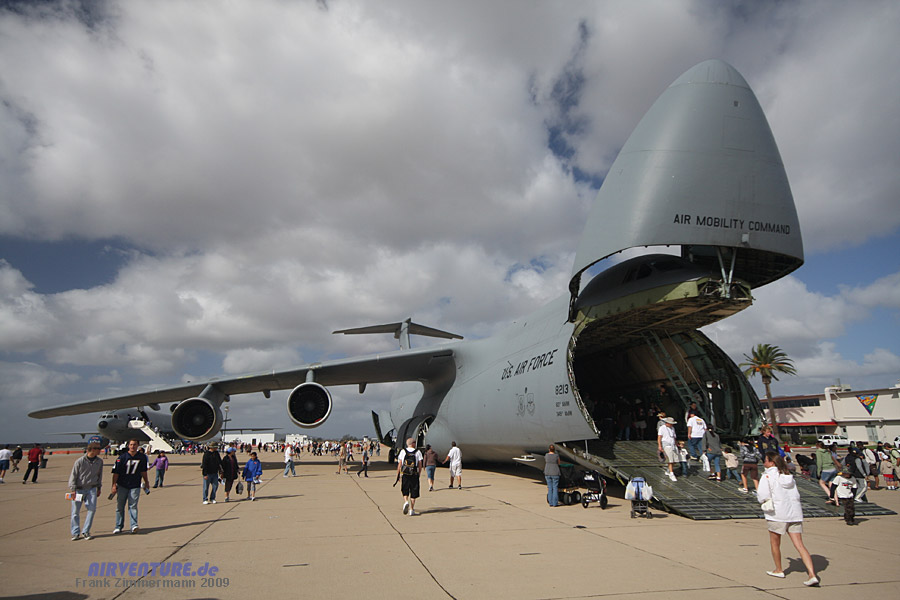Ein beeindruckendes Erlebnis, mal durch den 37m langen und 5,8 m breiten Frachtraum der mächtigen C-5 Galaxy zu gehen. Mit einer Nutzlast von über 100 Tonnen werden meist große und sperrige Lasten befördert. Wenn die Galaxy als Truppentransporter eingesetzt wird, können bis zu 345 Mann mitfliegen. |