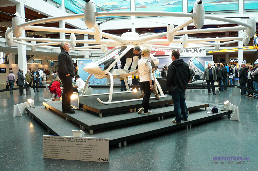 Im lichtdurchfluteten Eingangsbereich zur Messe erwartete den Besucher mit dem Volocopter VC200 ein besonderer Exot. Getragen von 18 elektrogetriebenen Propellern fand der (unbemannten) Erstflug des futuristischen, joystickgesteuerten Fluggeräts im November 2013 statt. |
