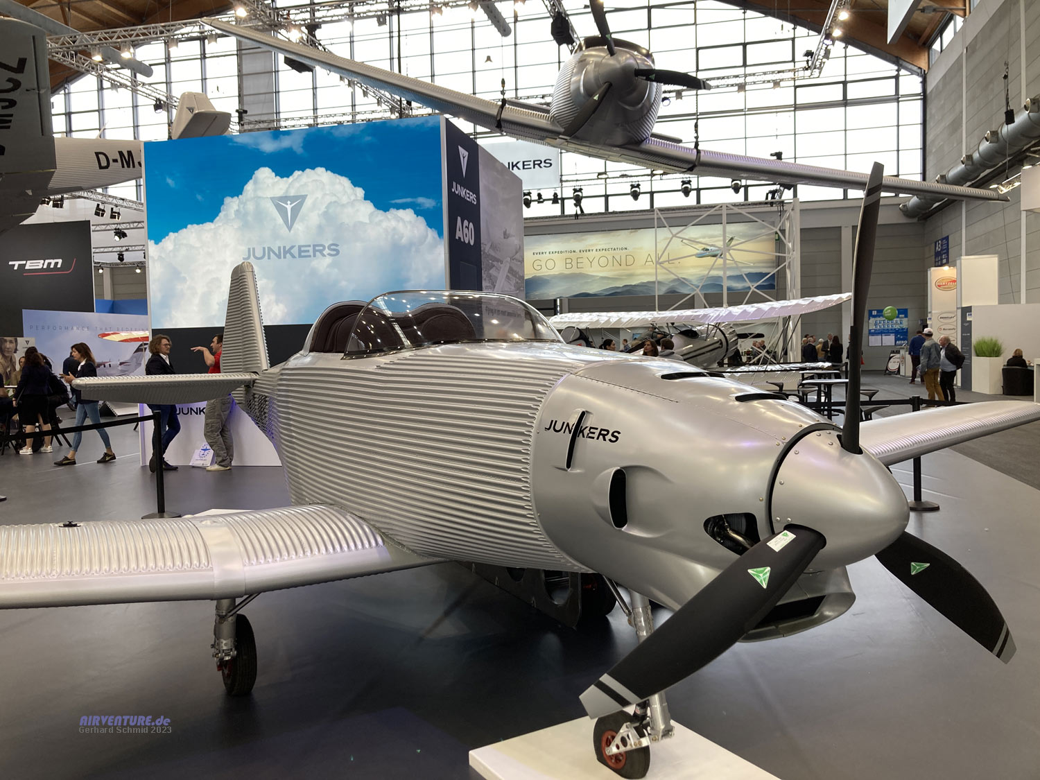 Retro ist schick... neben ihrem Tandemsitzer A50 brachten die Junkers Flugzeugwerke in diesem Jahr auch den kurz vor der Flugerprobung befindlichen Side-by-Side-Sitzer A60 zur Messe. Angetrieben wird der Wellblech-Tiefdecker von einem Rotax 912iS mit 100 PS.