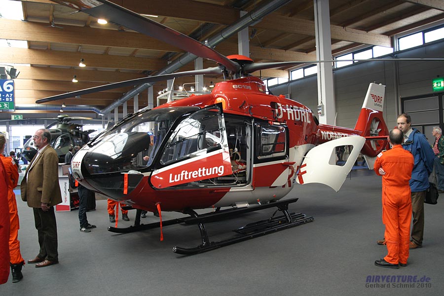 Mehr als 50 modernste Hubschrauber sind bei der DRF Deutschen Luftrettung im Einsatz. Zur Aero brachten die Rettungsflieger einen EC 135 mit. |