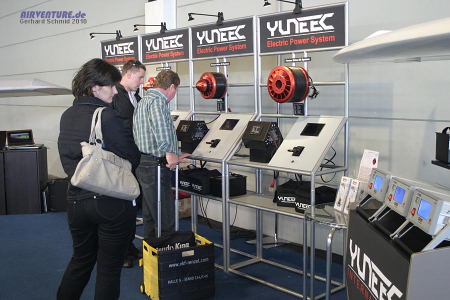 Die bürstenlosen Motoren für den Einbau in Ultraleichtflugzeuge konnte man am Stand von Yuneec ausprobieren. Das Leistungsspektrum reicht von 10 bis 60 KW. |