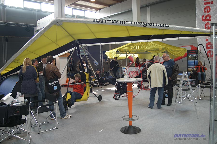 Gleitschirm-, Drachen- und Ultraleichtfliegen in seinen unterschiedlichen Formen kann man ausprobieren und lernen bei der West-Allgäuer Flugschule in Scheidegg. Zum Probesitzen hat die Schule ein Trike und ein Motorschirm-Gurtzeug aufgebaut. |
