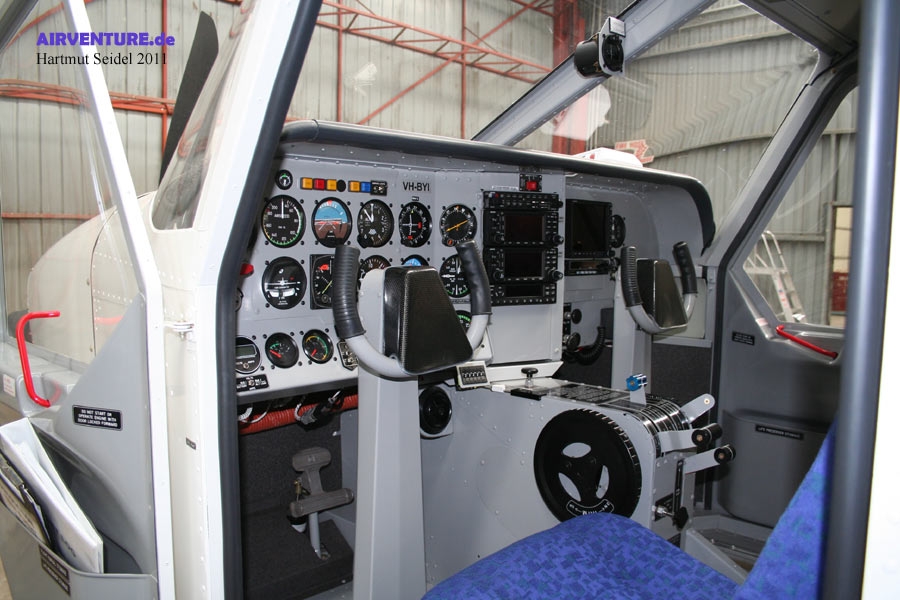Blick in das Cockpit des Weltumrundungs-Airvan mit dem Kennzeichen "VH-BYI". Der Flug um die Welt mit dieser Maschine wurde am 8. Juli 2010 erfolgreich abgeschlossen. Mit etlichen Zwischenlandungen wurden hierbei über 50.000 Kilometer zurückgelegt ! Es war dies übrigens die erste Weltumrundung in einem Flugzeug, welches komplett in Australien entwickelt und gebaut worden ist. |