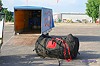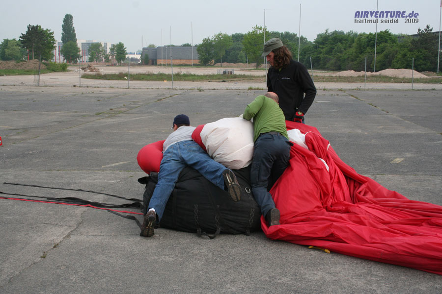 Die Luftschiffhülle muß erst sorgfältig auf dem Boden ausgebreitet werden, ehe sie mit der Gondel verbunden werden kann. Seitlich an der Gondel befestigt ist eine von den insgesamt bis zu vier Propangasflaschen zu sehen, die für die Gasversorgung der beiden Brenner mitgeführt werden können. |