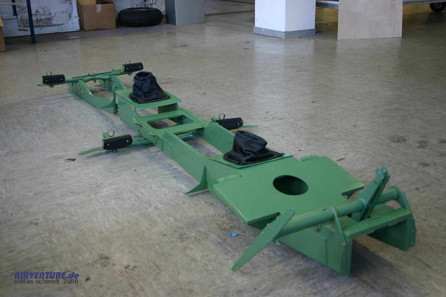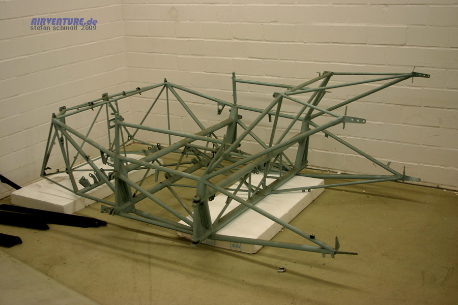 Die zentrale Einheit der Bestmann wurde aus einem Stahlrohrgerüst gefertigt. Hier wurden Flügel, Motor und der hintere Rumpf angebracht. Derzeit ist der Holzflügel der Bestmann noch in Berlin eingelagert. Er wird aber in den kommenden Monaten ebenfalls nach Dortmund transportiert werden. |