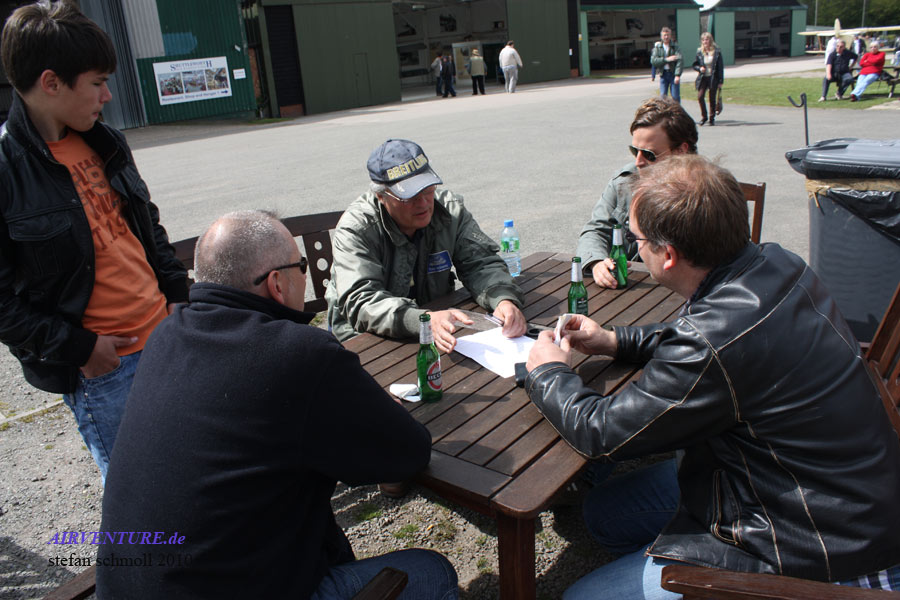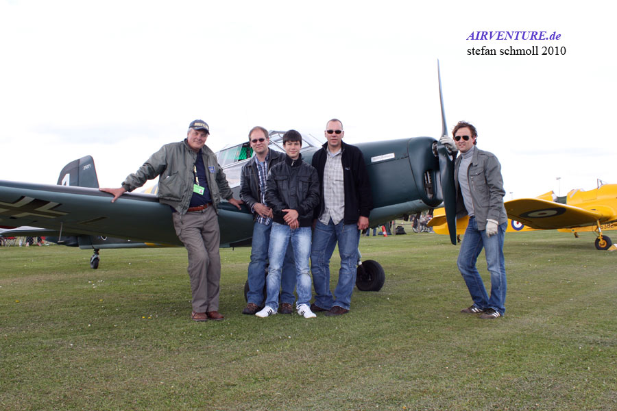 Detailbesprechung zwischen Peter Holloway und den Quax-Fliegern am Samstagnachmittag. Zwar hat er sich von seinen Maschinen getrennt. Aber zum Glück sind sie zukünftig nur eine Flugstunde entfernt stationiert. Und da Peter mittlerweile aktives Mitglied in unserem Verein ist, kann er "seine" Bücker auch weiterhin fliegen. |