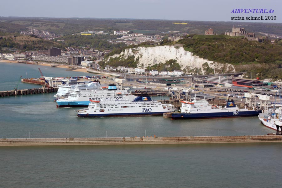 Na ja, die Kanalüberquerung verlief problemlos und dank des Rückenwindes sehr schnell. Und als wären wir verabredet, sind wir just in dem Moment über die Fähre unserer Bodentruppe geflogen, als diese gerade in Calais anlandete. Hinten unter dem Schornstein kann man sie erahnen? |