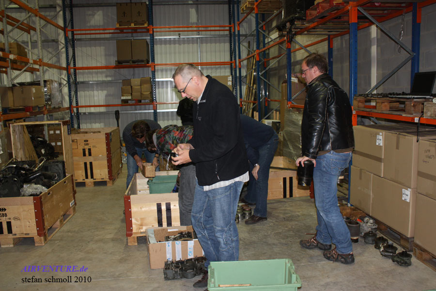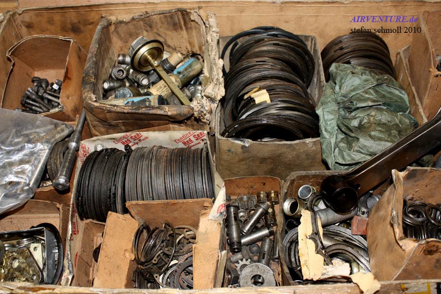 Dutzende Kisten waren voll mit Motorblöcken, Einzelteilen und Anbauteilen. Zwar ist nicht mehr Alles im Topzustand, aber die Techniker unserer Reisegruppe sind trotzdem froh, die Sammlung gemeinsam mit dem neuen Flieger erworben zu haben. Nach Stunden der Sichtung und Umpackung waren Bullies und Anhänger voll bis zum Rand. |