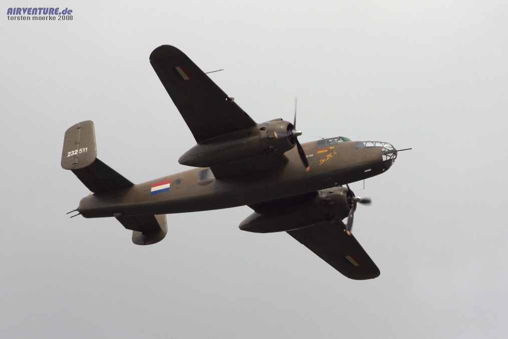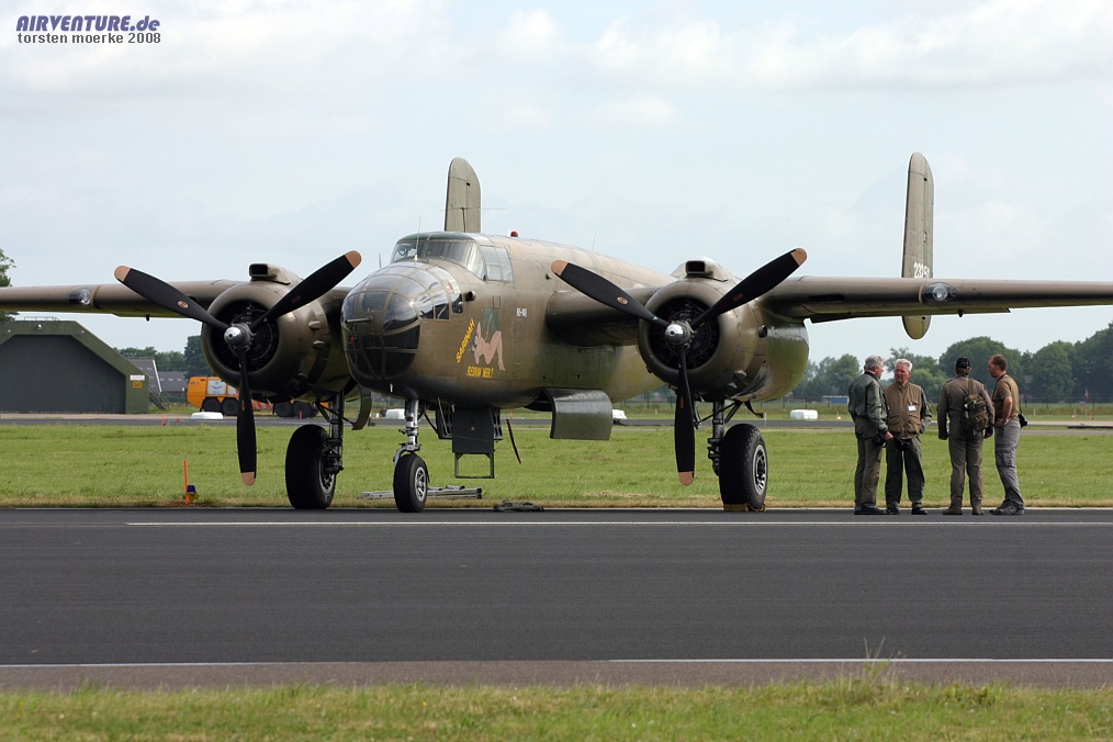 Die B-25 der Duke of Brabant Air Force wurde 1944 von North American gebaut. Nachdem sie 1989 in einem bedauernswerten Zustand in den USA gefunden wurde, begann Ihr neues Leben als gern gesehener Airshow-Gast im Mai 1990. |