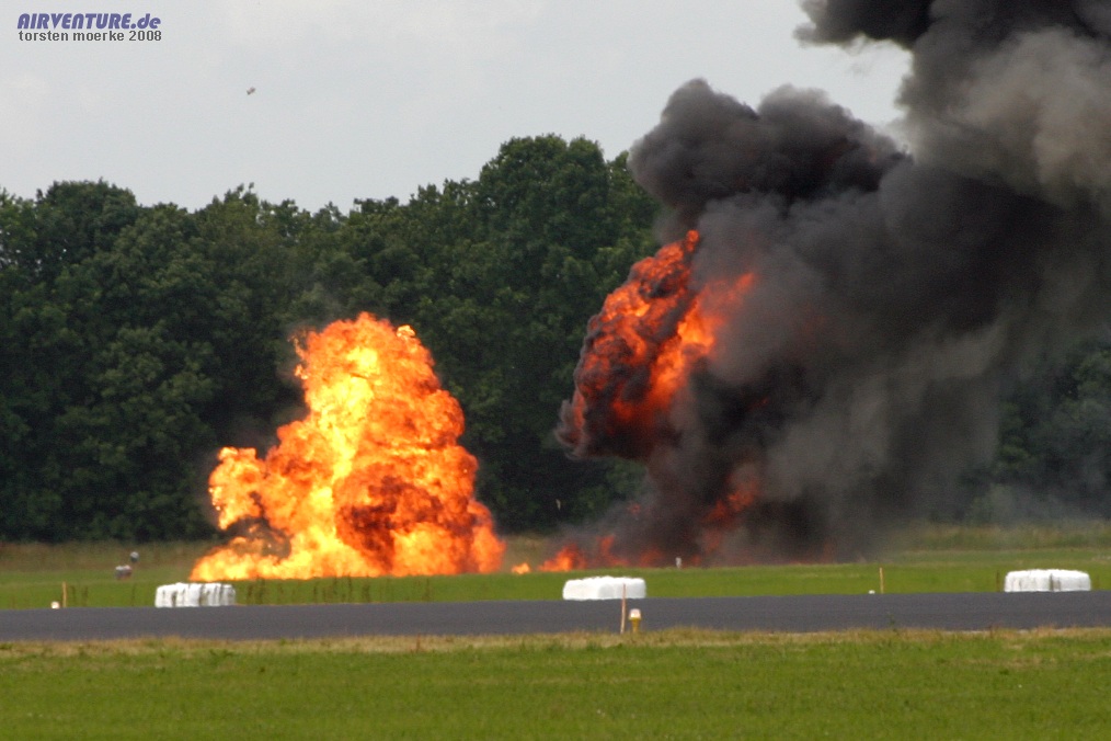 Auch an Pyrotechnik wird bei den Open Dagen nicht gespart. Ein simulierter Flugplatzangriff wird eindrucksvoll duch explodierende Strohballen unterstützt, die später von einer Chinook gelöscht werden. |