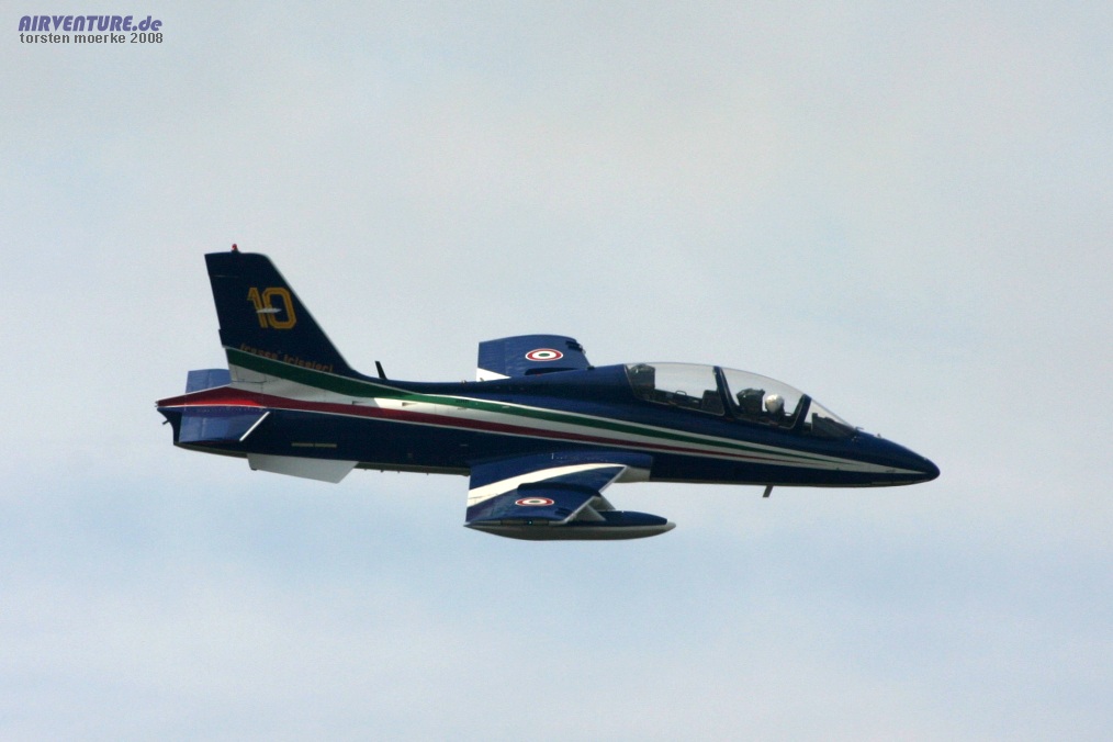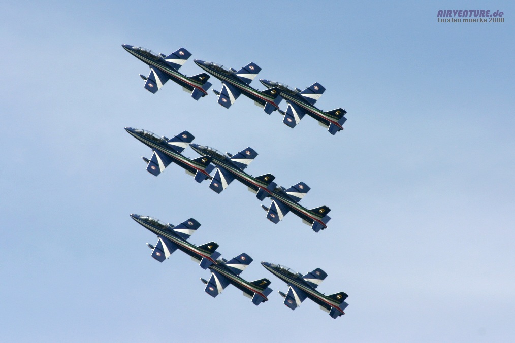 Am 27.April 1982 ersetze die Aermacchi MB.339 die bisher eingesetzte Fiat G.91 und wird bis heute geflogen. Mittelfristig ist geplant die FT mit neuen Flugzeugen vom Typ Aermacchi M 346 auszustatten. |