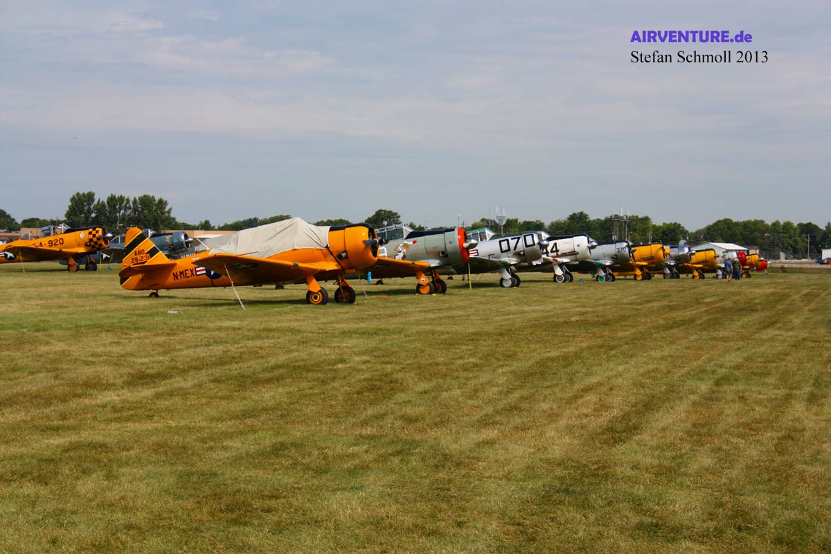 2013 ist das Jahr der North-American Harvard. Vor 75 Jahren wurde sie erstmals als Militärtrainer eingesetzt. Natürlich sollten zu diesem Anlass mindestens 75 Exemplare nach Oshkosh kommen. Eine Zahl, die leicht erreicht worden ist. Die mehr als 15.000 gebautenT-6 fanden auf allen Kontinenten noch lange Verwendung. Demzufolge sind Heute noch hunderte Exemplare weltweit in flugfähigem Zustand erhalten. |