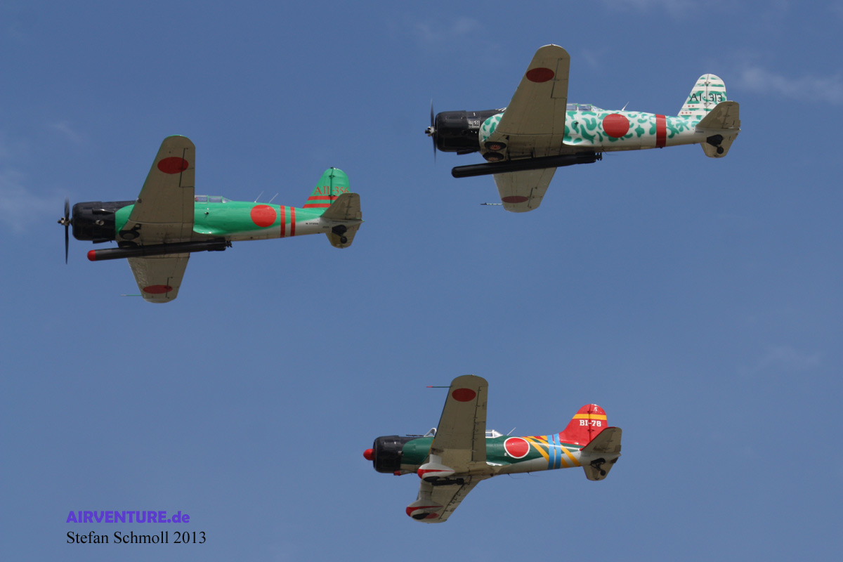 "TORA! TORA! TORA!" war der entscheidende Angriffsfunkspruch der Japaner zu Beginn der Angriffe auf Pearl Harbor und diente auch als Filmtitel für die aufwändige Verfilmung der Ereignisse aus dem Jahr 1970. Gleich acht der damals eingesetzten "japanischen" Flugzeuge werden noch Heute von der CAF betrieben. Das zwanzigminütige Spektakel gehörte zu den Höhepunkten der Warbirdshow in Oshkosh. |
