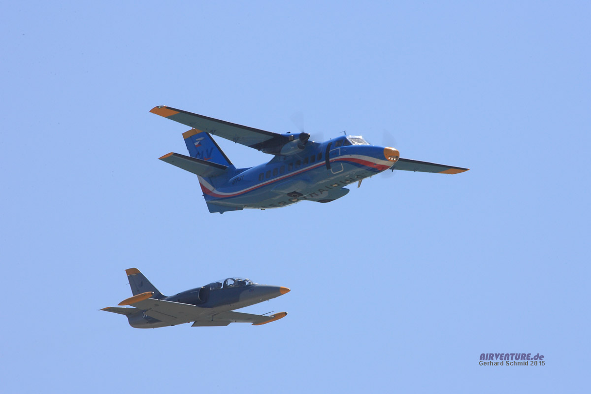 Ein LET L-410 Trainer der CLV (AEROTRAINING), gefolgt von einer Aero L-39, die aufgrund der relativ geringen Geschwindigkeit dir Landeklappen zur Erhöhung des Auftriebs gesetzt hat.