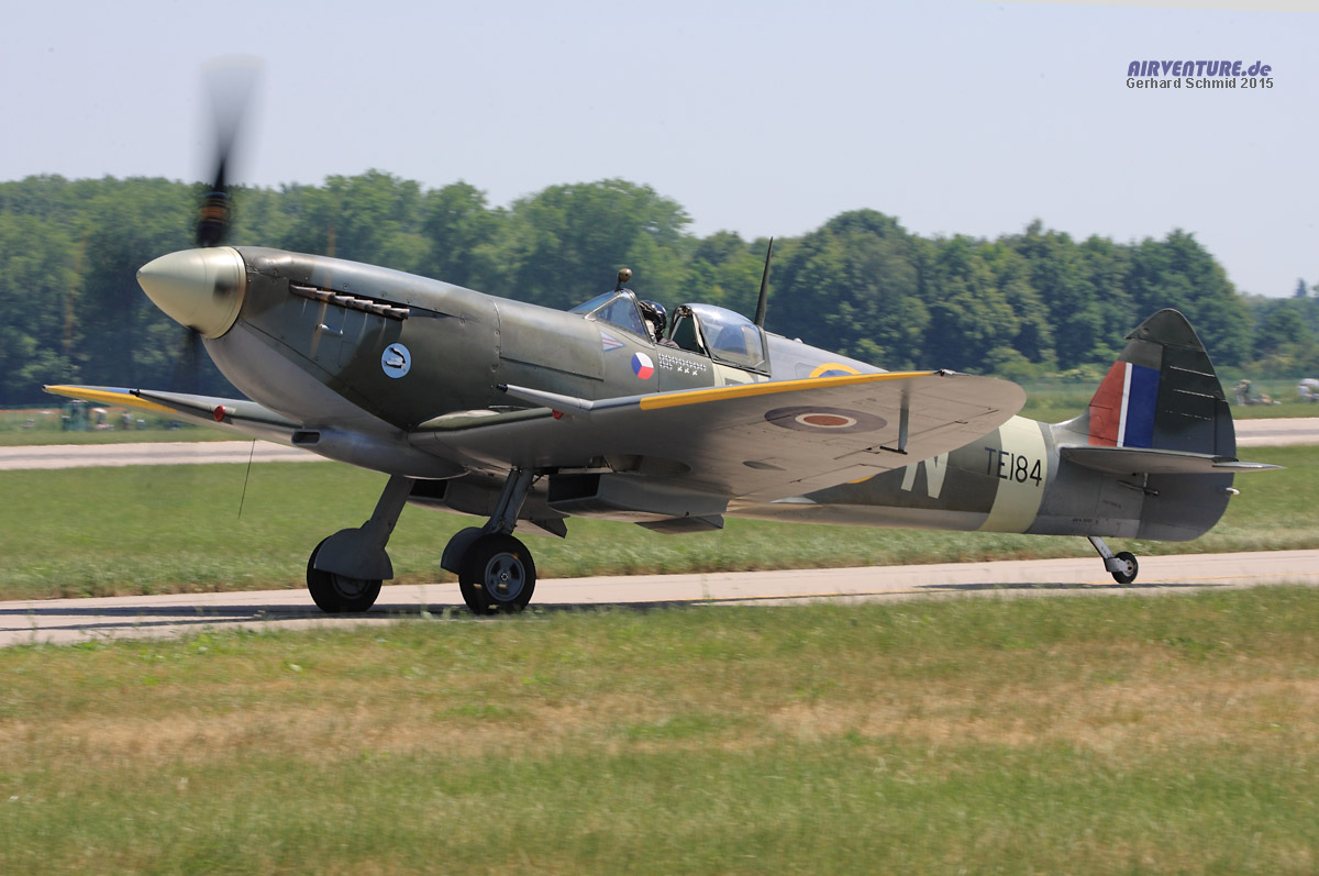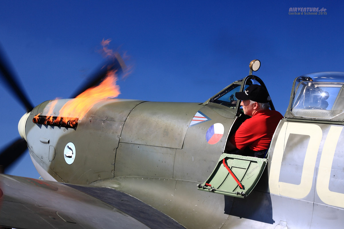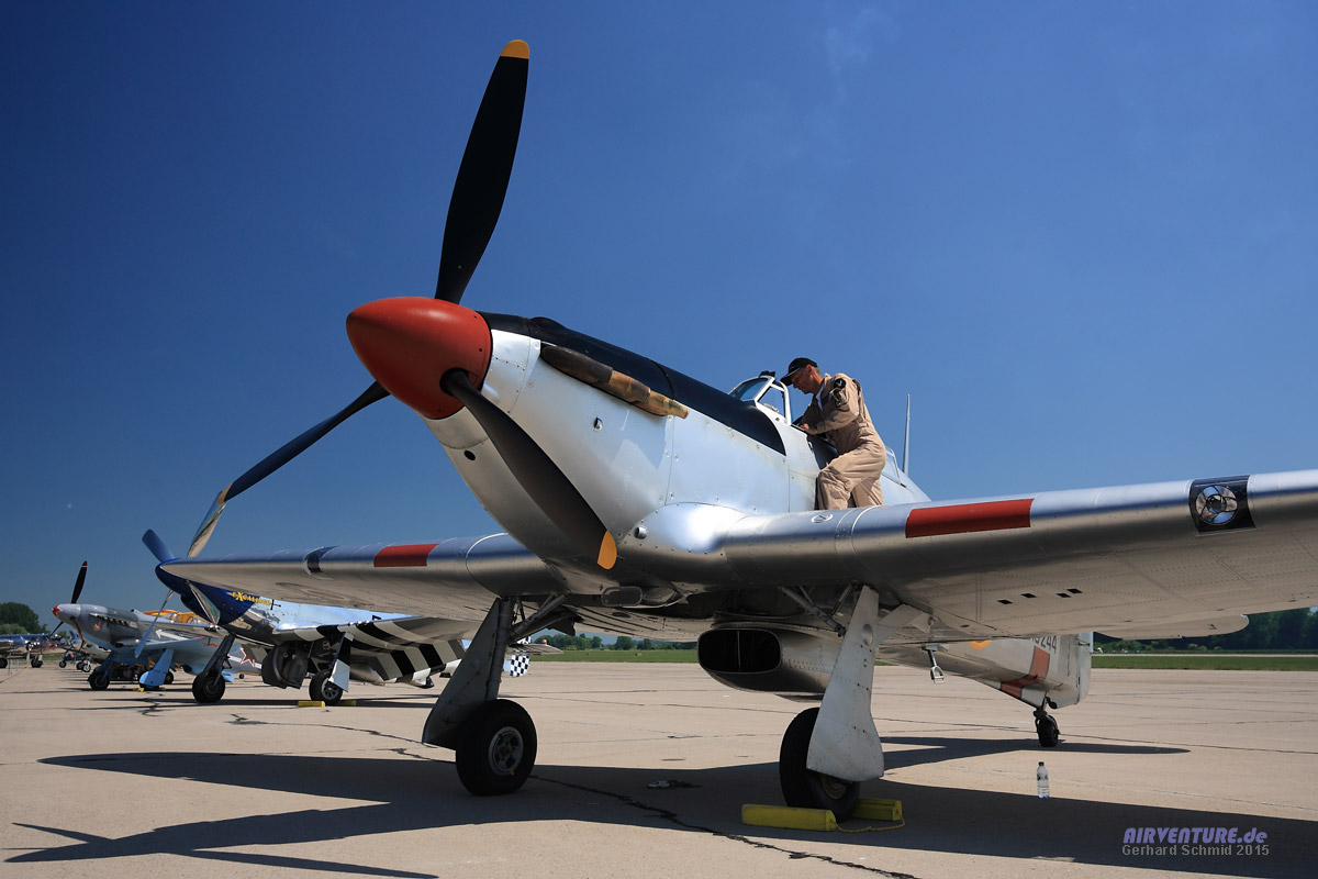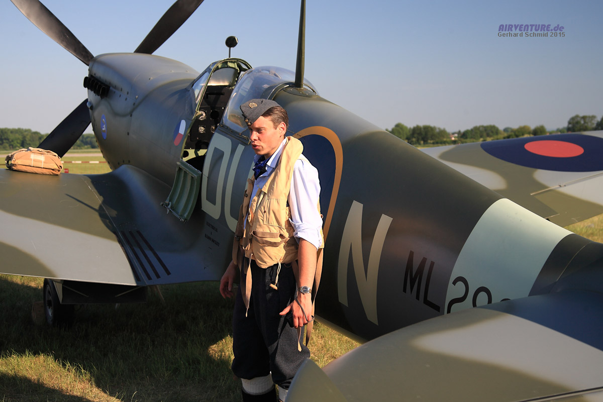 Die großen Gegner von einst... die schöne Spitfire LF.XVI war von Motorproblemen geplagt. Pilot Dan Griffith hat sich redlich um eine Fehlerbeseitigung bemüht, leider war bis zuletzt ein zuverlässiger Motorlauf nicht gewährleistet. |